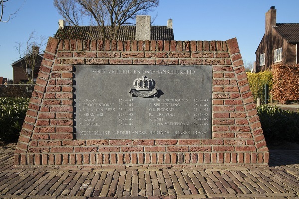 Het andere monument, op de foto, gedenkt de 12 gesneuvelde militairen van de Prinses Irene Brigade. Bijzonder aan dit monument is de ingemetselde grenspaal (replica) van de landingsplaats langs de Maas, waar de brigadisten op 24 april 1945 aan wal kwamen.