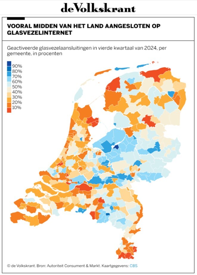 Het is bijzonder en mooi om te zien dat de digitale bereikbaarheid in het buitengebied van de 7 deelnemende gemeenten de afgelopen jaren zeer sterk is verbeterd aldus Nettenbreijers; “Daar waar in het verleden de kwaliteit van internet in het buitengebied van Maasdriel en Regio Rivierenland van twijfelachtige kwaliteit was is dit door de aanleg van glasvezel volledig omgedraaid. We zijn met ander woorden koploper geworden in Nederland, terwijl we in het verleden achterblijver waren”. Het een en ander wordt mooi geïllustreerd aan de hand van onderstaande afbeelding die afkomstig is uit een artikel van de Volkskrant en is gebaseerd op informatie afkomstig van de CBS/ACM.