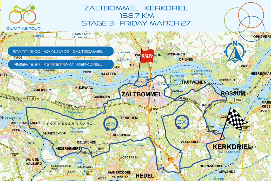 De tour start om 12:00 uur op de Waalkade in Zaltbommel en eindigt om 15:47 uur in de Kerkstraat in Kerkdriel. De huldiging is om 16:00 uur op de parkeerplaats van winkelcentrum De Delkant aan de Gasthuisstraat.