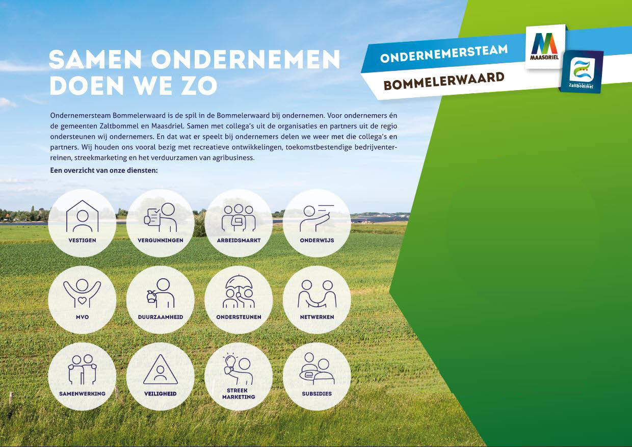Om bestaande én nieuwe ondernemers in de Bommelerwaard beter van dienst te zijn, hebben de gemeenten Zaltbommel en Maasdriel het Ondernemersteam Bommelerwaard ingericht. Eén centraal loket waar alle bestaande en nieuwe ondernemers met hun vragen terecht kunnen.