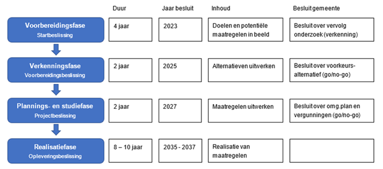 De gemeenteraad neemt nu dus nog geen definitief besluit, dat besluit volgt later. De verkenningsfase duurt naar verwachting 2 jaar. Vervolgens is er nog een planuitwerking nodig (inclusief vergunningen). Ook die fase duurt circa 2 jaar. Realisatie van de plannen kan in 2027/2028 starten.